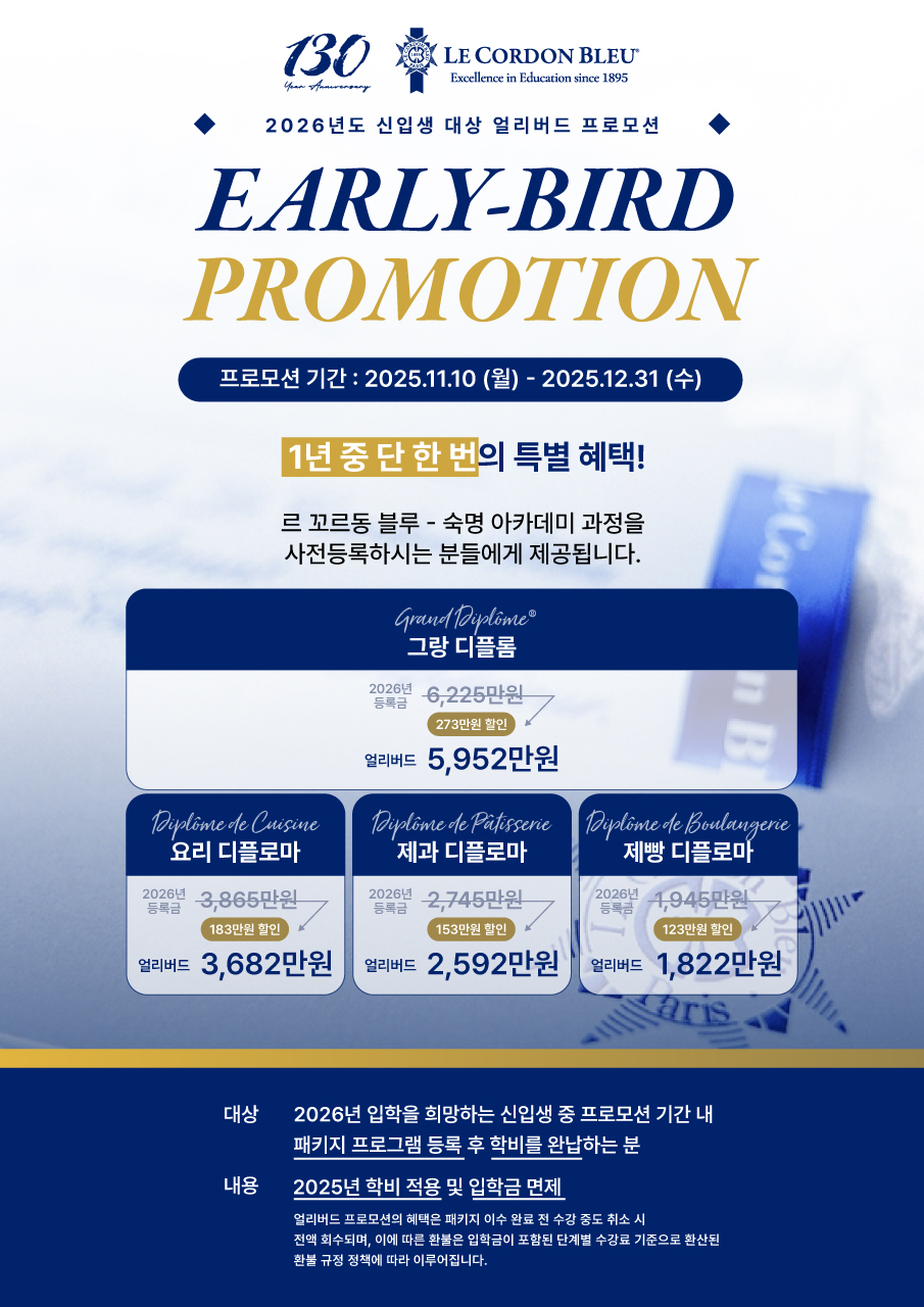 르 꼬르동 블루 - 숙명 아카데미, 2026년도 신입생 등록금 얼리버드 프로모션