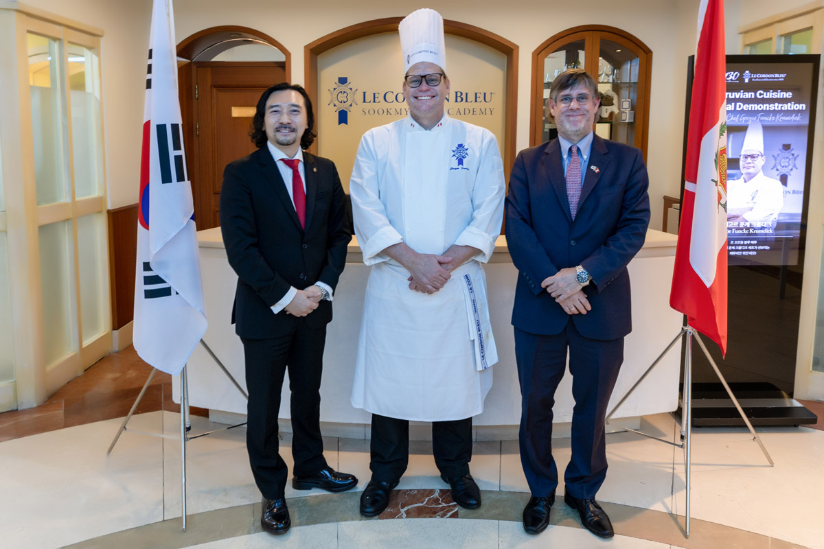 홍일영 - 르 꼬르동블루–숙명 아카데미 총지배인(왼쪽), 그레고르 푼케 크룸디크 르 꼬르동 블루 페루 셰프 (중앙), 파울 페르난도 두클로스 주한 페루 대사 (오른쪽)