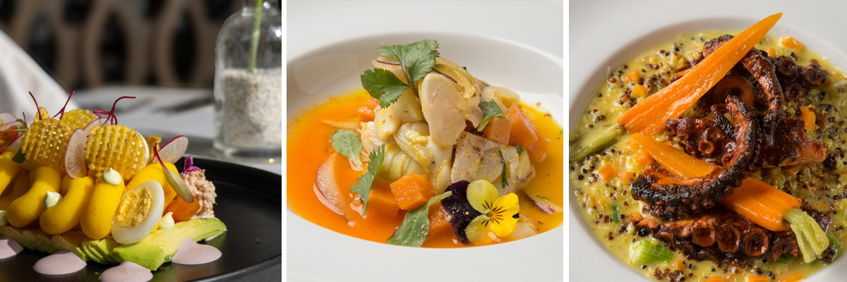 왼쪽부터 1. 카우사 리메냐 – 페루 리마 스타일의 감자 케이크 / 2. 옐로우 칠리 “레체 데 띠그레” 세비체 – 페루식 생선 마리네 / 3. 퀴누아와 안티쿠초 소스를 곁들인 문어 소떼