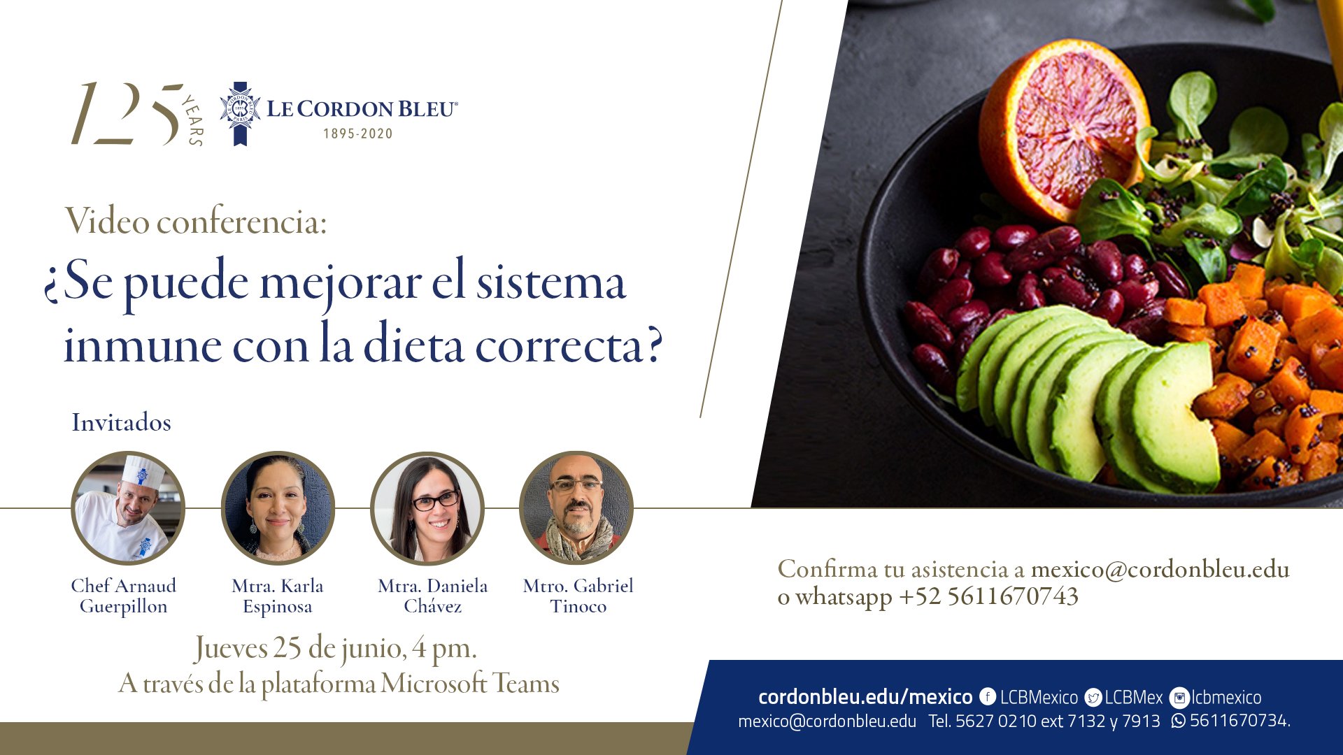 El próximo jueves 25 de junio, en el marco del próximo inicio de nuestro Diplomado en alimentación y gastronomía saludable en línea, Le Cordon Bleu Mexico City ha organizado para ti el webinar “¿podemos mejorar nuestro sistema inmune con una correcta dieta?” en el cual nuestros académicos y chef realizarán un debate para resolver la pregunta antes descrita.