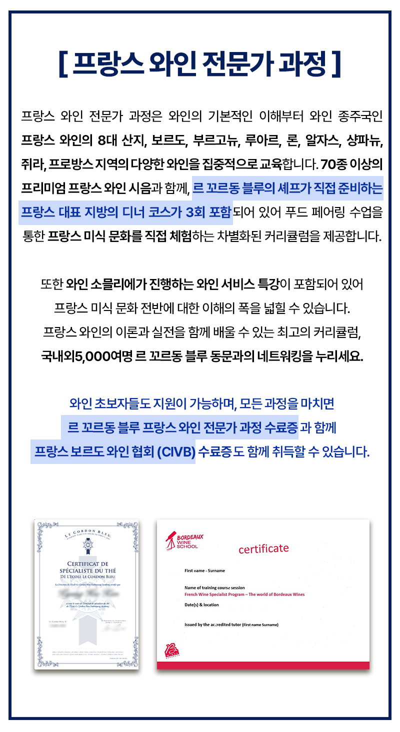 - 르 꼬르동 블루 프랑스 와인 전문가 과정 수료증 취득